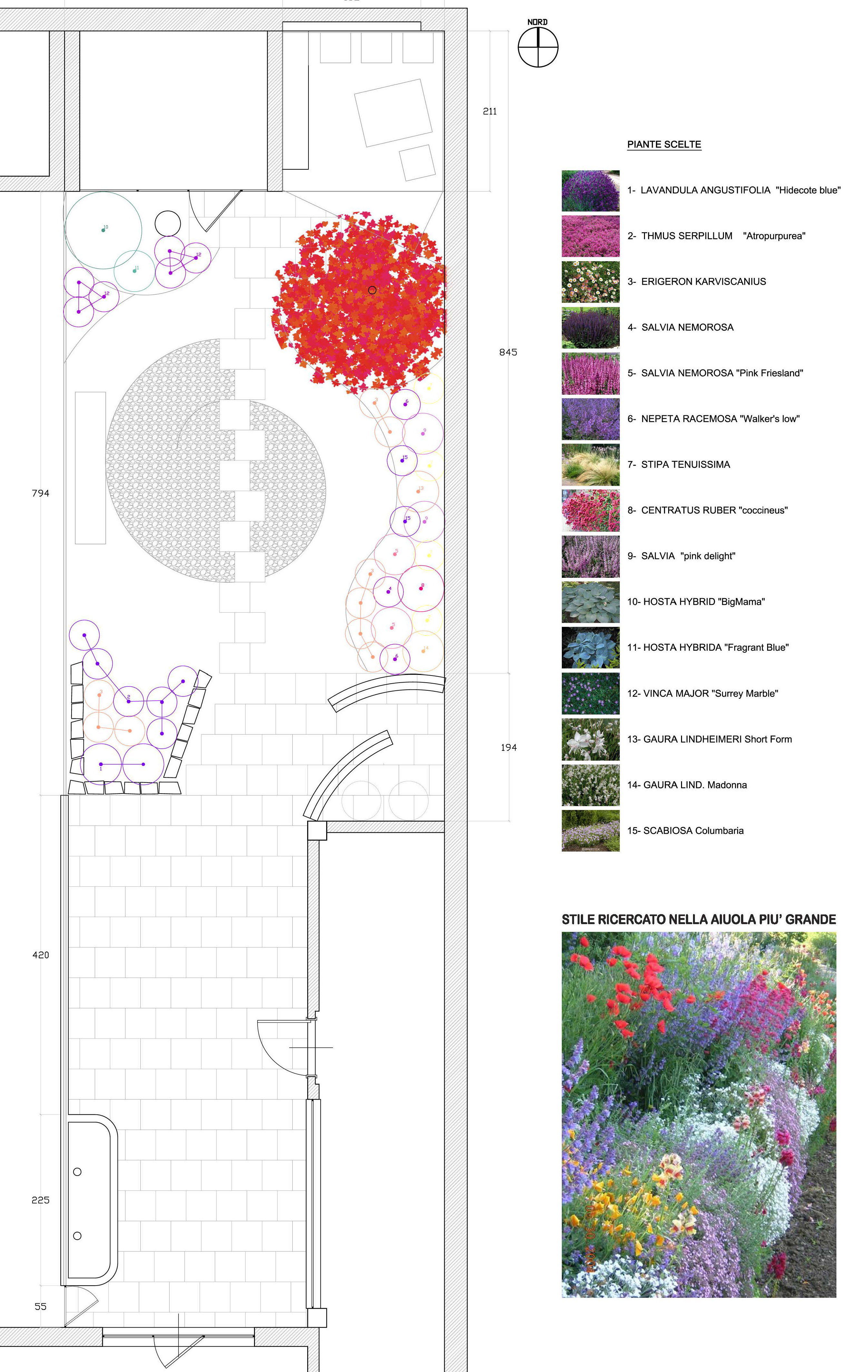 Ciottoli rosa impreziosiscono il disegno di impianto, un acero rosso segna l’angolo ombroso, mentre una bordura di erbacee perenni e graminacee regala all’insieme un’impronta “naturale”.
