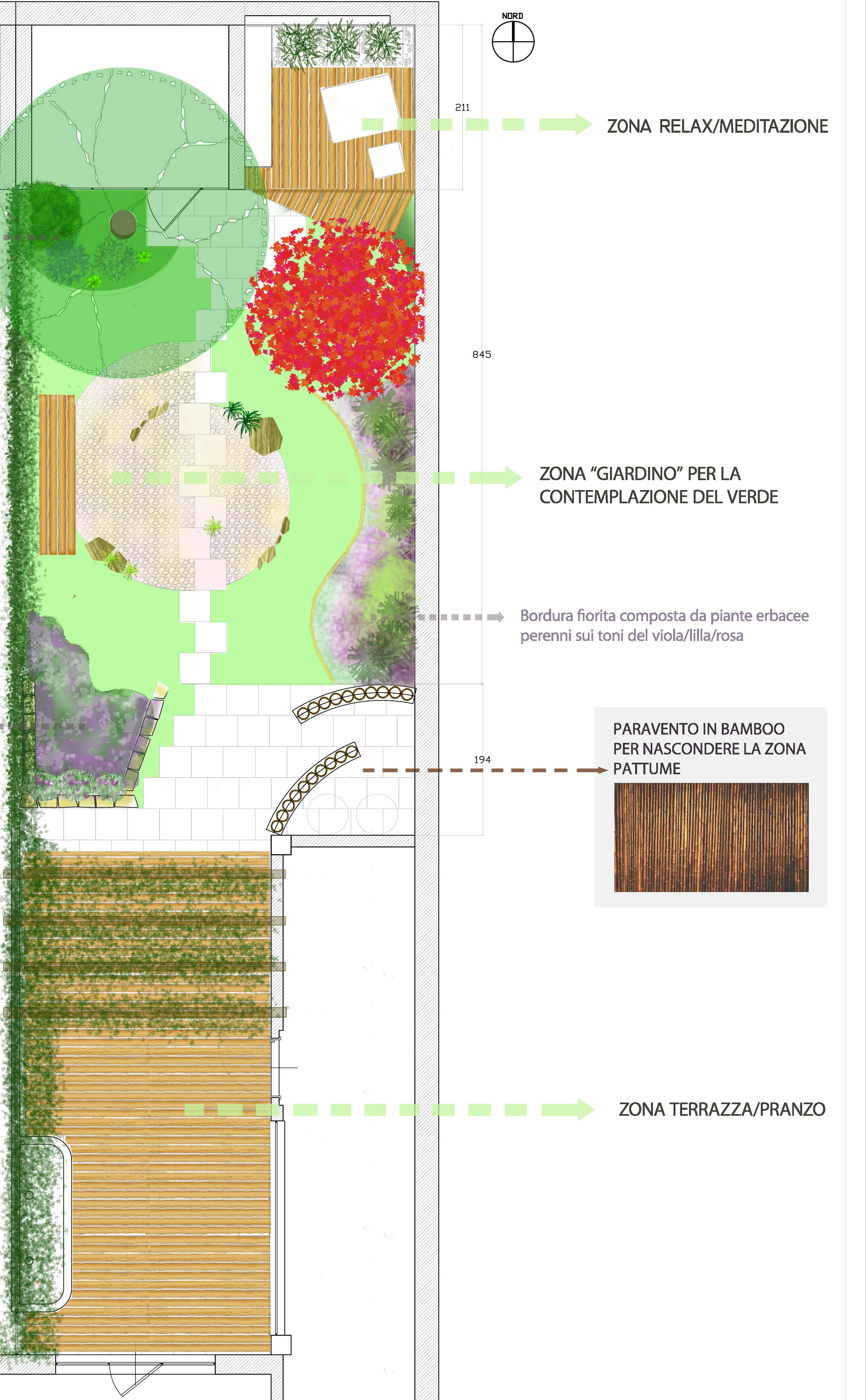 Piccolo, cinto da alte mura, è un angolo segreto di verde di cui solo i proprietari possono godere. La committente voleva uno stile informale e naturale, angoli di relax e la possibilità di contemplare il suo spazio di verde con tranquillità.
